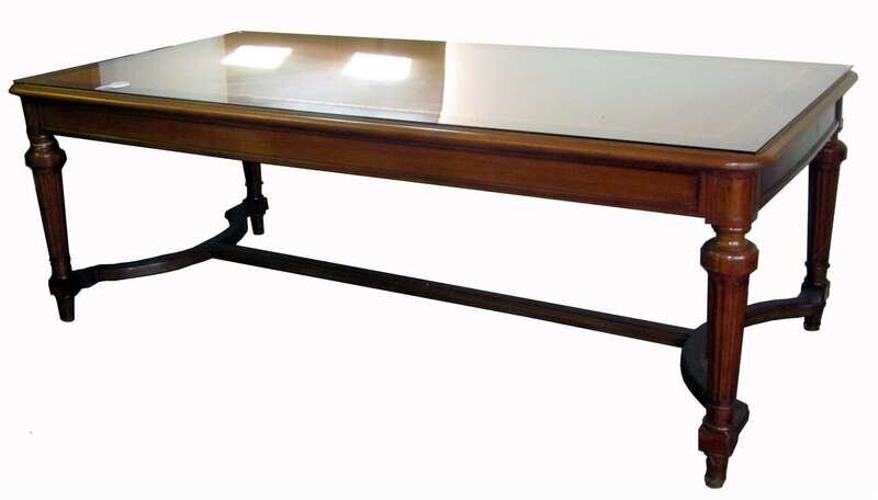 The leather inset rectangular top with molded edge, above fluted tapering legs united by H-frame stretcher.