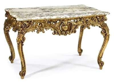The serpentine marble top over acanthus, C- and S-scrolled apron, raised on cabriole legs ending in scroll feet.