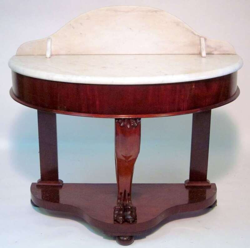 The demi lune marble top over plain frieze, above lion monopoedia, above conforming base raised on bun feet.