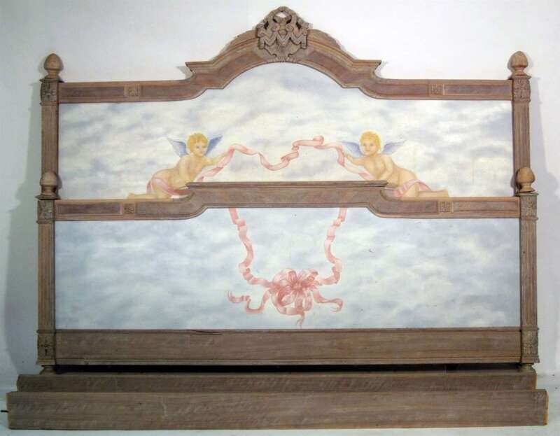 The shaped molded crestrail depicting swags and foliage, the headboard painted to show cherubs amongst clouds holding a heart-shaped ribbon, raised on shaped feet.