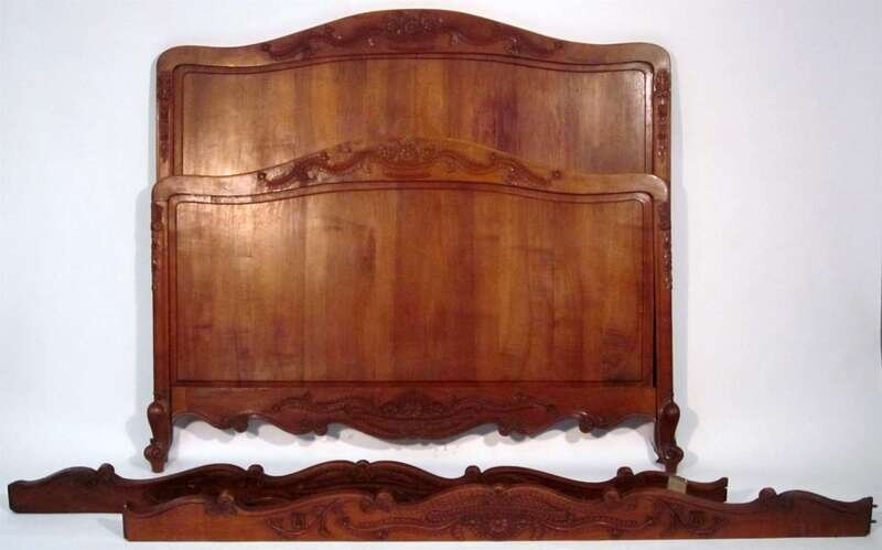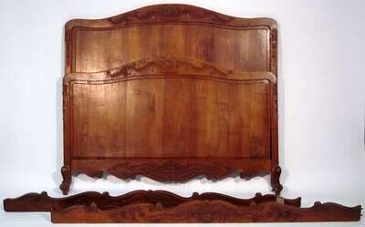 The head and footboards with arched crestrail, carved to show floral bouquets and foliate swags, the shaped apron and siderails similarly carved, raised on short cabriole legs.