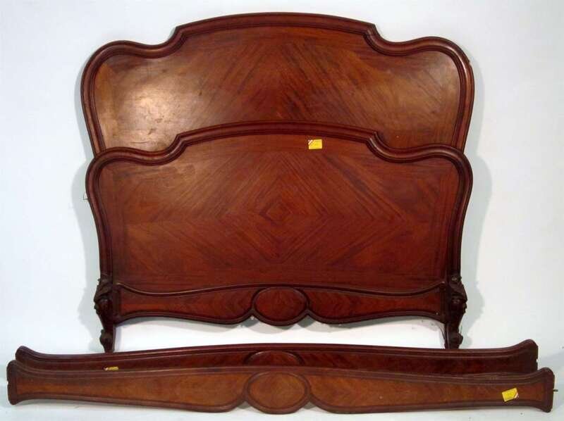 The shaped toprail enclosing a crossbanded panel raised on carved cabriole legs, the apron and siderails similarly carved with blank central cartouches.