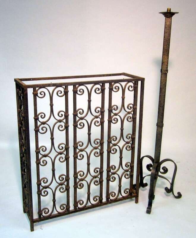 The plain standard terminating in tripartite base; together with a nineteenth century wrought iron radiator cover. (2).