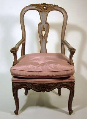 The crested channeled toprail over vasiform splat, above curved channeled arms with acanthus capped supports, raised on crested apron and cabriole legs.
