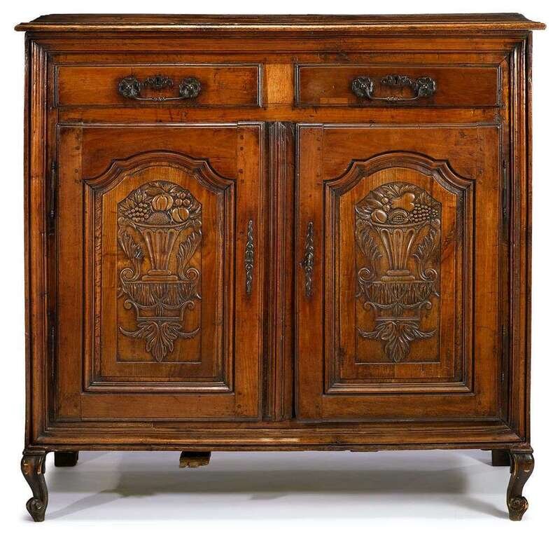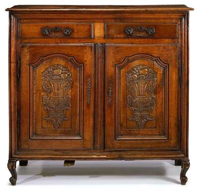 The planked retangular top, over two short drawers, above twin panelled cupboard doors carved to a show an urn full of fruit, raised on short cabriole legs.