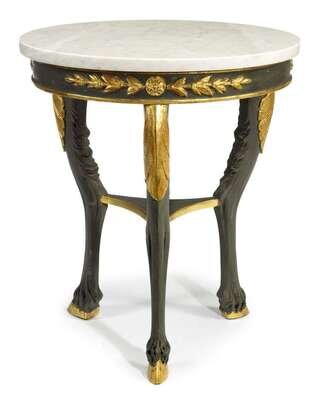 The circular white marble top over three monopoedia carved supports terminating in hairy carved hoof feet.