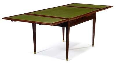 The rectangular leather inset top with two leather inset draw-leaves, above two short drawers to the ends, raised on fluted tapering legs terminating in brass caps.