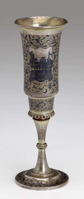 The sides worked to show views of the Kremlin, surrounded by foliate scrolls, above a beaded collar, over a knopped stem terminating in circular foot.