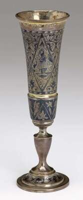The sides worked to show costumed figures and foliate scrolls, above knopped stem over circular foot.