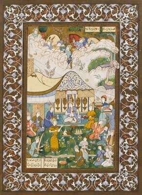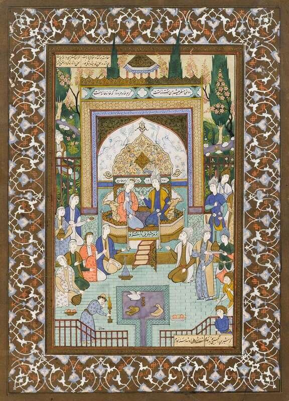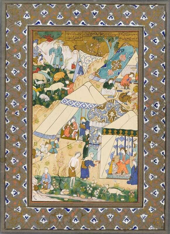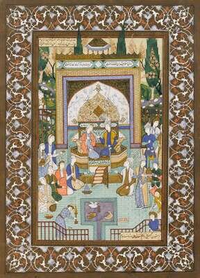 Ink, watercolor and gilt on paper, two painted with court scenes, depicting musicians and attendants; the other depicting tents with figures and animals in a landscape. All with inset boxes of arabic script, mounted on card with illuminated borders. (3).