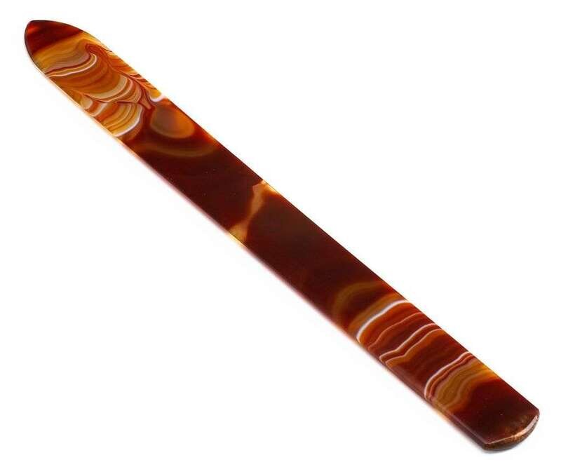 Typical blade form, orange with banded grey and white highlights, in presentation box.
