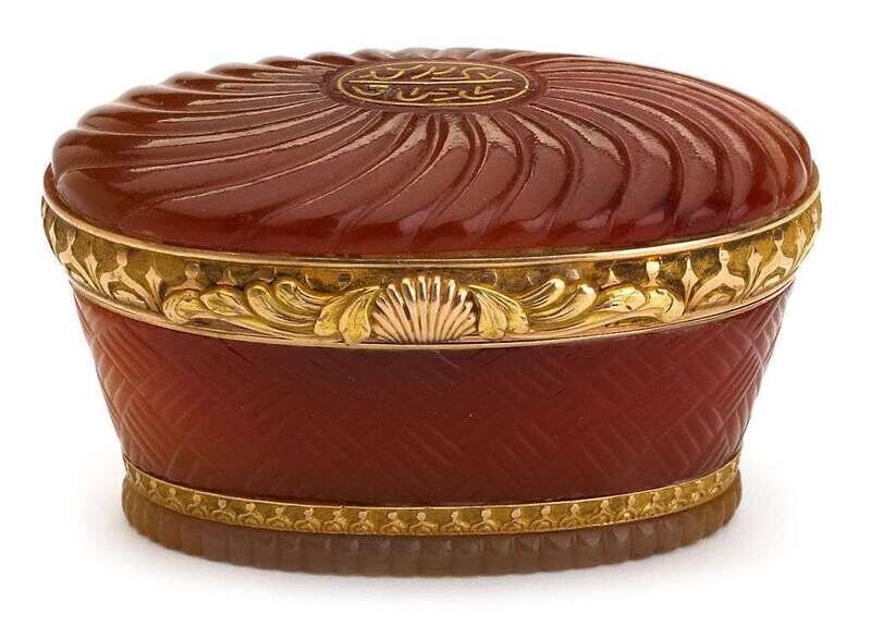 Unusual Continental rose gold, gilt metal mounted carnelian pill box late 19th century