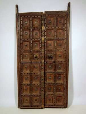 A gadrooned frame around two sectional door panels, each section decorated with a metal flower at its center, with ironwork and studs around each section.