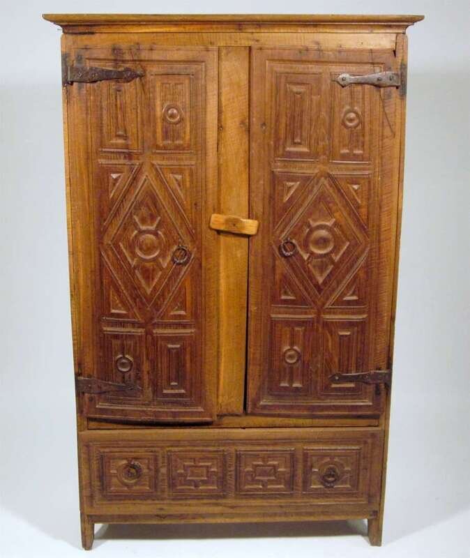The square molded top over two carved cupboard doors, revealing three shelves, above a single carved long drawer, terminating in short square legs.