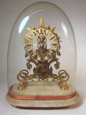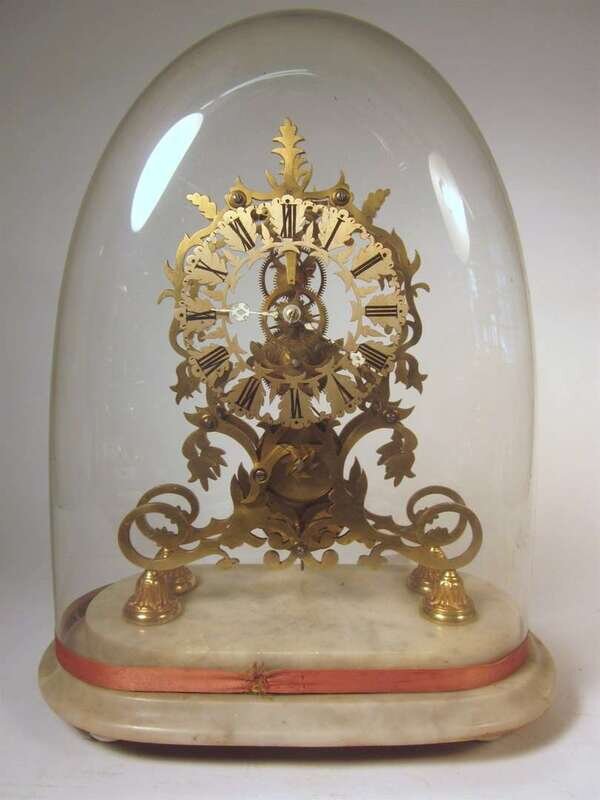 The pierced chapter ring with roman numerals, the visible works and scrollwork brass frame behind, raised on an oval marble base and housed under a glass dome.