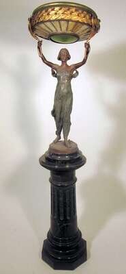 Modeled as a maiden in flowing green dress holding aloft the circular light fixture, with individual panes of marbled glass and frieze of gilt metal leaves interspersed with red glass "berries", raised on gray-green marble pedestal. (2).