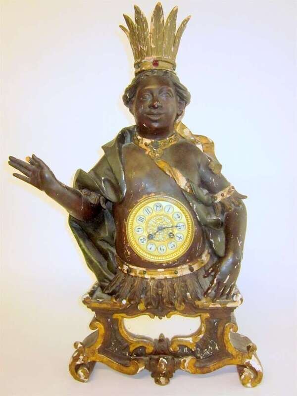 The circular gilt face with Arabic numeral hours fitted in a wood case carved and painted as the bust of a native wearing a jeweled and feathered crown, raised on a scrolling base.