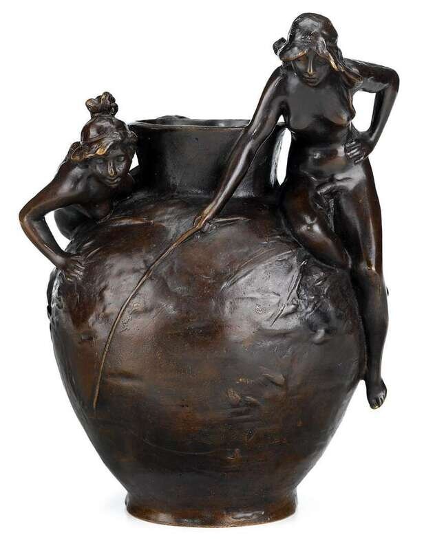 Bronze, mid-brown patina, the vase with straight neck and ovoid body, mounted with two semi-nude maidens fishing. Inscribed "A. Foretay."