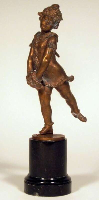 Bronze, light brown patina, depicting the young girl in a dress with hands wrapped in fur, one foot extended out behind her, inscribed signature to the base, terminating on a cylindrical black marble base.