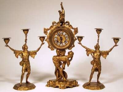 The gilt metal circular dial with enameled ceramic Roman hour markers, surmounted by a figure of a child, above a Japanese woman bending over to support the clock terminating in a diamond shape base decorated to show lion masks, c-scrolls, and shields; the garnitures issuing a central standard and two candlearms above armed male Japanese figures on circular bases.