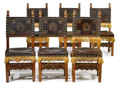 Six continental fruitwood and leather side chairs