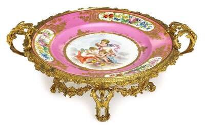 Large Sevres style pink ground bronze mounted charger late 19th/early 20th century