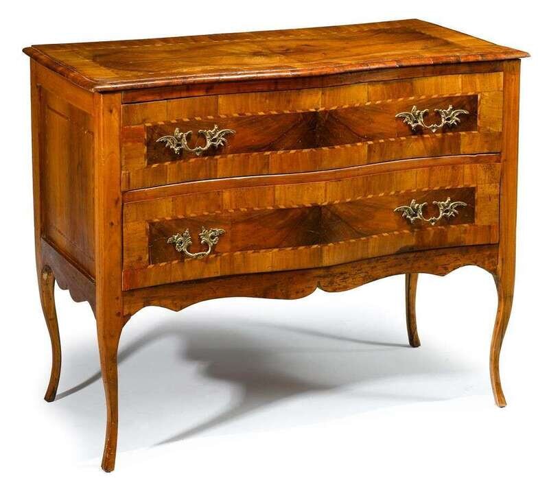 The serpentine top with banded edge above a conforming case of two long drawers, raised on slender cabriole legs.
