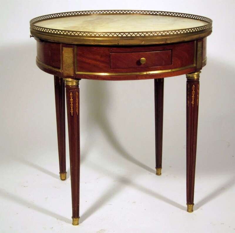 The circular white marble top with galleried edge, with two drawers to the frieze, raised on fluted mounted legs.