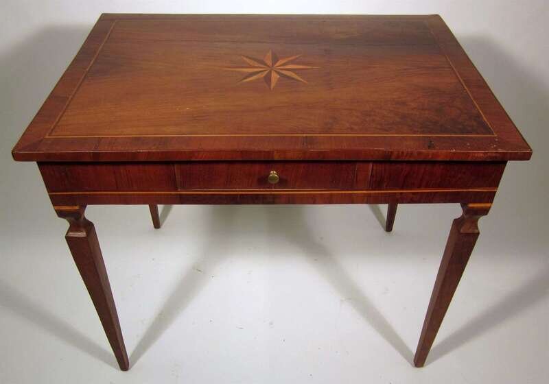 The rectangular top with central star medallion, over single drawer to the frieze, raised on tapering square legs.