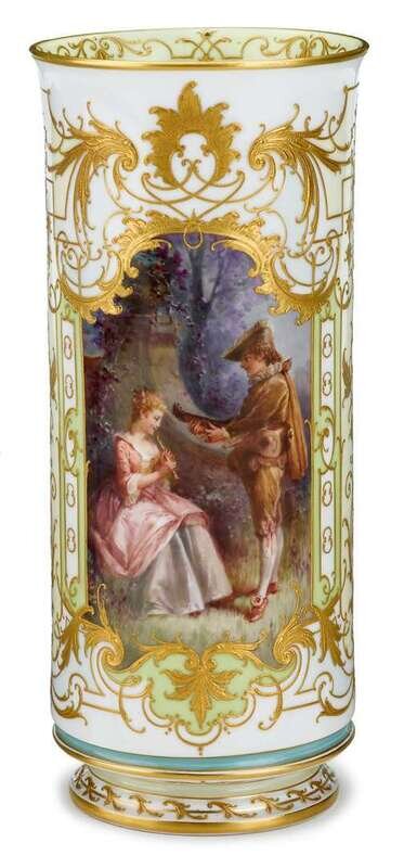 Tall cylindrical form, the front depicting a pair of musicians in a naturalistic setting, on a cream ground, with applied gilt swags and scrolls, the reverse depicting a floral bouquet issuing from an applied gilt urn, raised on a circular foot.