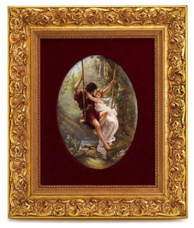 The oval plaque depicting an amorous young couple seated on a swing, the young lady in diaphonous robes embracing her swain and gazing into his eyes, in a wooded landscape with stream, signed "A. Duburg 1870" lower right, impressed KPM and scepter marks on verso, mounted in red velvet within a rectangular giltwood frame.
