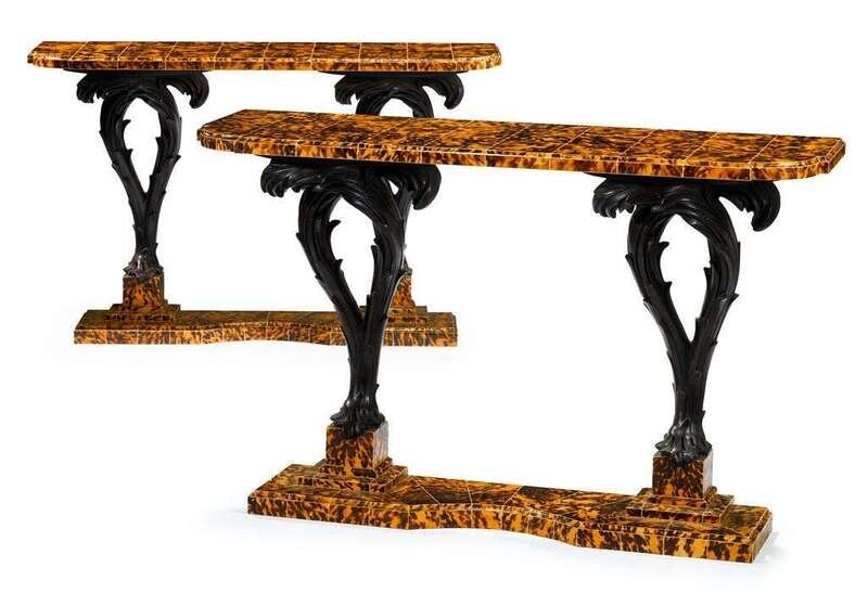 Impressive pair of faux tortoiseshell and carved fruitwood consoles