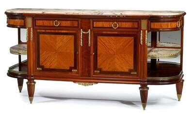 Louis XVI style mahogany and kingwood gilt metal mounted marble top sideboard early 20th century