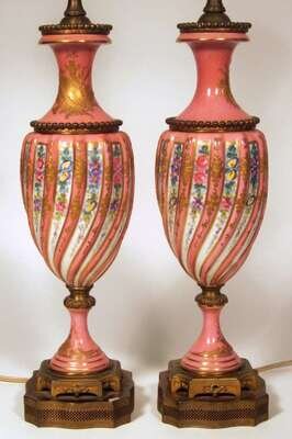 Pair of Sevres style gilt metal and salmon ground porcelain urns