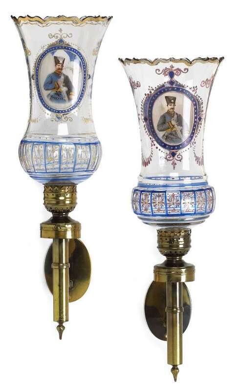 Each with trumpet form shade painted in the Persian style with two reserves, one showing the "Lion and Sun" depicting a lion holding a sword with a sunburst behind, the other a man in military attire, both within blue and purple borders and surrounded by dots and scrolls.