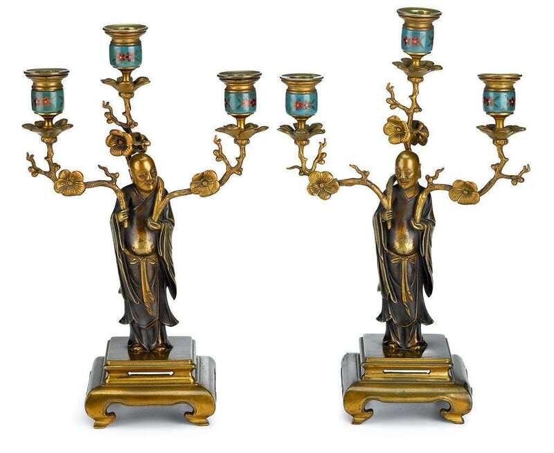 Pair of French enameled and gilt metal 'chinoiserie' candelabrum early 20th century