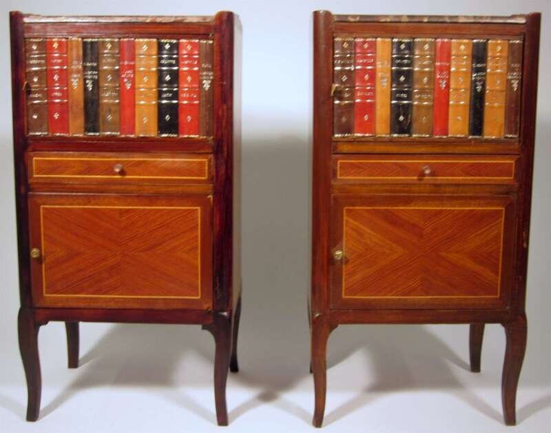 The rouge painted square top surmounting a simulated book facade cupboard door, over short drawer and conforming cupboard door, raised on cabriole legs.