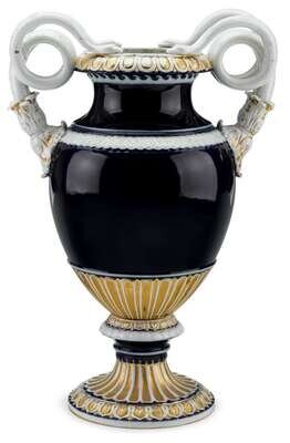 The ovoid cobalt body mounted with handles modeled as coiling snakes, the foot, handles, and rim decorated in gilt over floral and leaf-tip motifs. Underglaze blue crossed swords marks, incised mark A148.