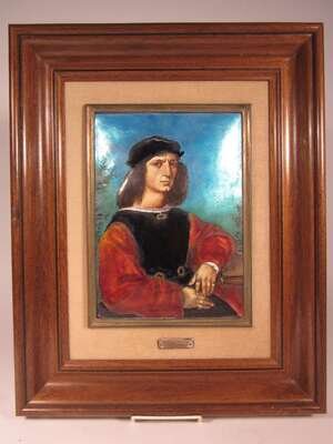 The convex plaque depicting the artist with long hair in a cap, dressed in renaissance costume, sat in a naturalistic setting.
