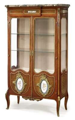 Transitional style gilt metal and sevres style porcelain mounted kingwood vitrine late 19th century