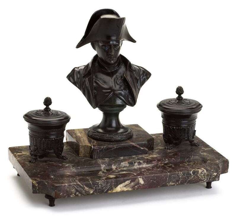 The patinated bronze bust flanked by twin covered inkwells raised on shaped marble base with pen recess, above toupie feet.