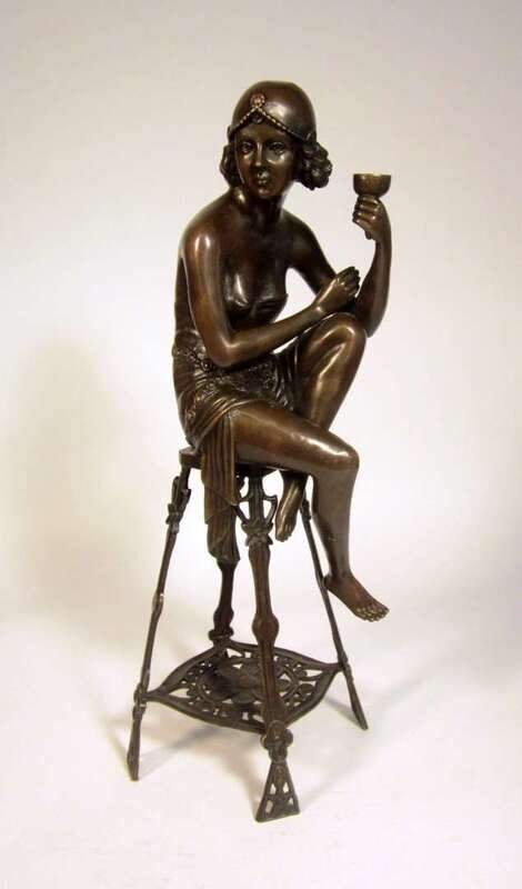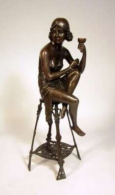 Bronze, dark brown patina, depicting a semi-nude lady wearing a bonnet holding a goblet, sat upon a tall stool.