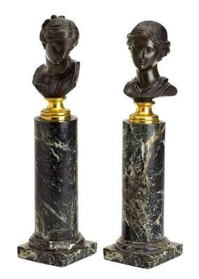 Bronze, dark brown patina, on ormolu socle bases, mounted on verde antico marble pedestals. (2).