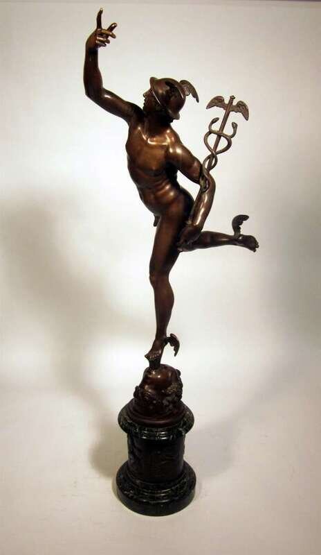 Bronze, mid-brown patina, depicting Mercury pointing to the sky and holding the caduceus in his left hand, his right leg outstretched behind him, his left leg supported by a wind-head, raised on a cylindrical verde antico marble base mounted with a bronze frieze depicting the seasons.