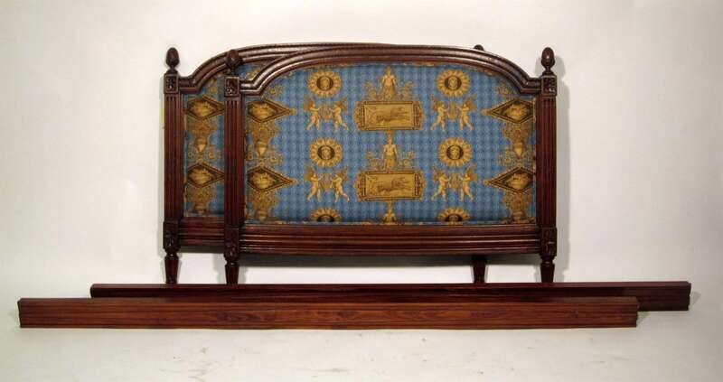 The head and foot board with shaped top rail flanked by fluted supports surmounted by pine-cone finial.