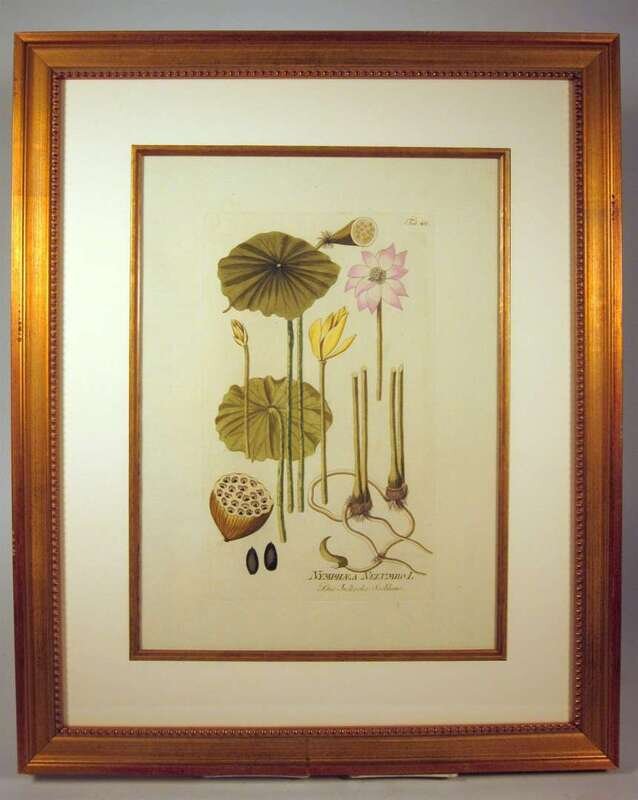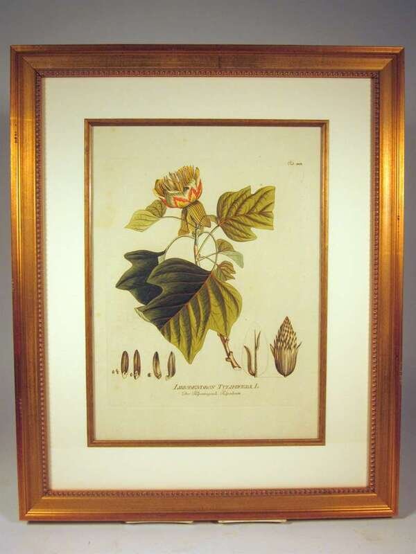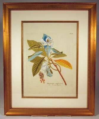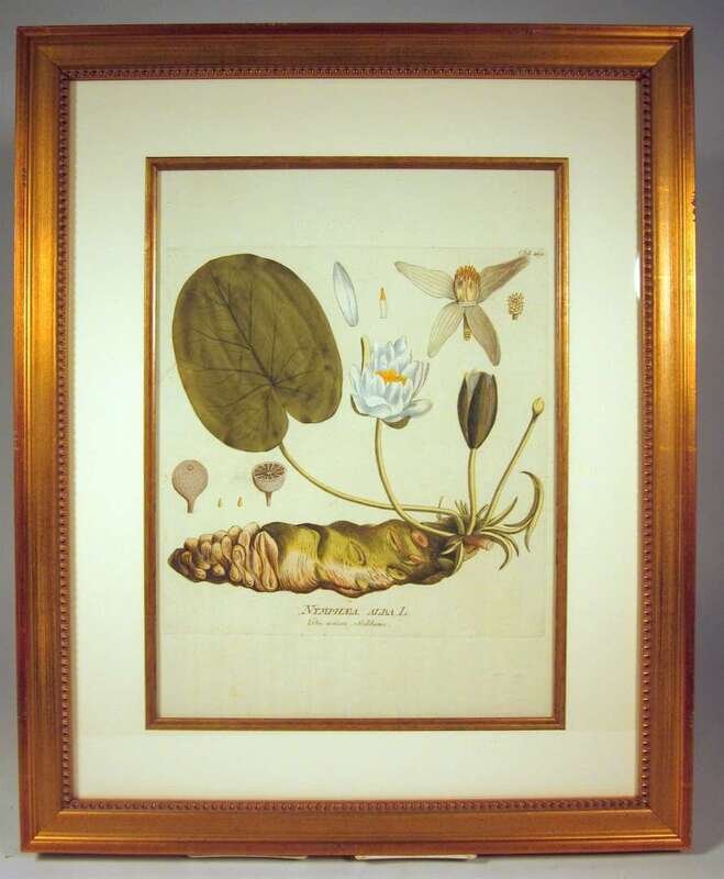 Four hand-colored copper engravings of flowers, including "Liriodendron Tulipifera," "Nymphaea Nelumbo," "Magnolia Glauca," "Nymphaea Alba," from "Icones Plantarum Medicinalium", published Vienna, 1788-1803, framed, matted, and glazed. (4).