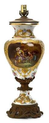Baluster form, the body painted with a figural scene surrounded by a gilt border, surrounded by floral bouquets, raised on scrolling gilt metal base. Converted to a lamp.
