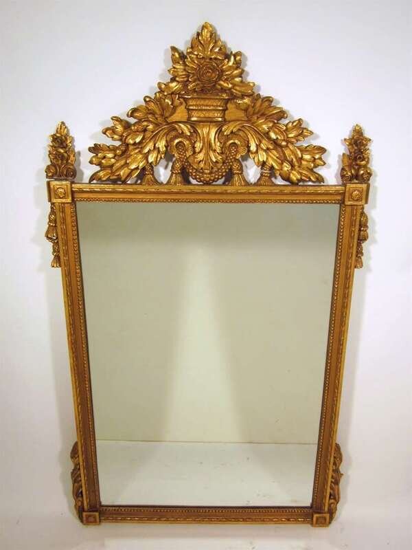 The rectangular mirror plate within a bead edge sight, within a ribbon twist border and paterae within squared corners, surmounted by a urn issuing floral and acanthus sprays.