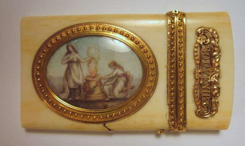 Rectangular form, the hinged cover applied with banner 'souvenires the body mounted with a painted ivory plaque within a gilt metal border.