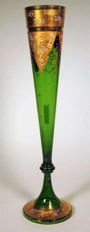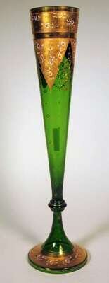 The tall tapering cylindrical body with gilded and foliate enameled rim, raised on slender knopped stem and circular gilt and foliate enameled foot.
